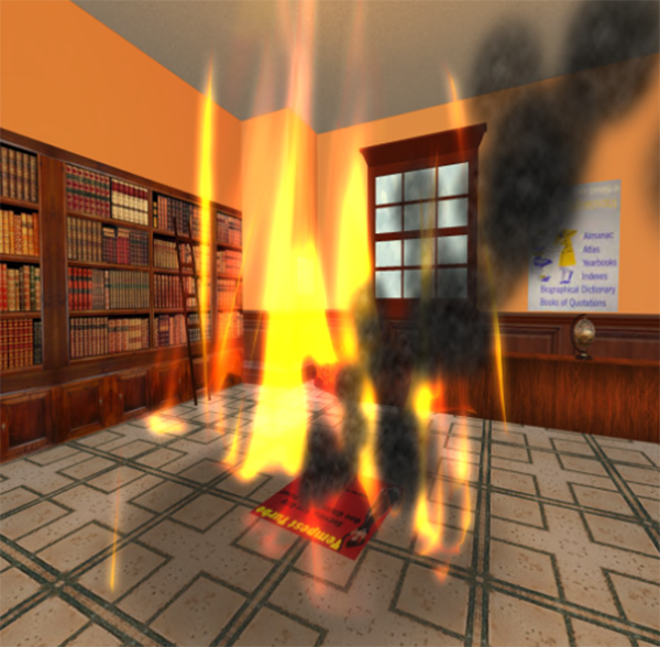 Fire Chief Martijn Mendle and his crew rushed to the scene when War Room manager Dream Destiny called 911. Arriving within minutes, the fire department discovered the rare book stacks and library Customer Service counter consumed in flames. Within 20 minutes they SCFD contained the fire.